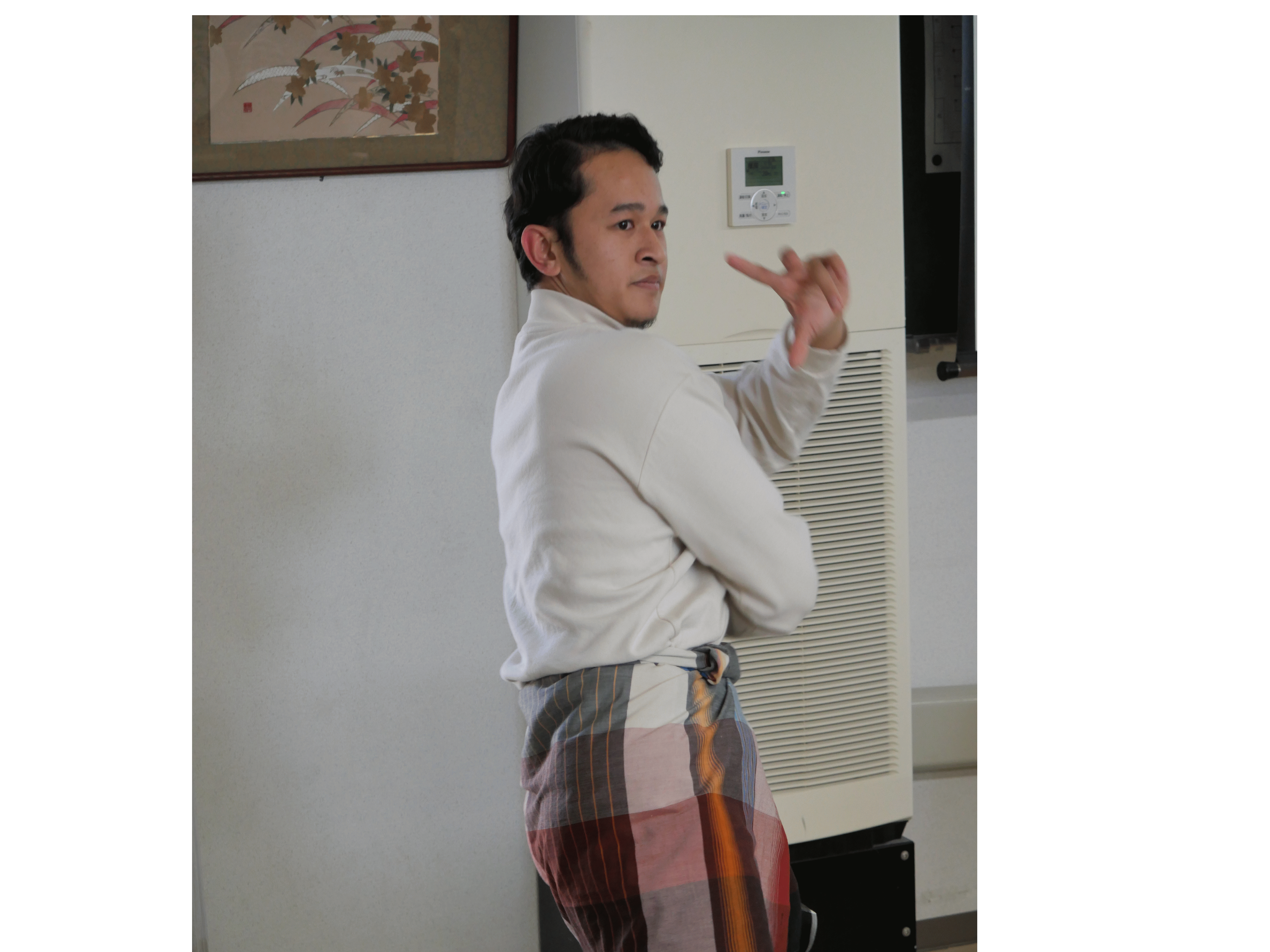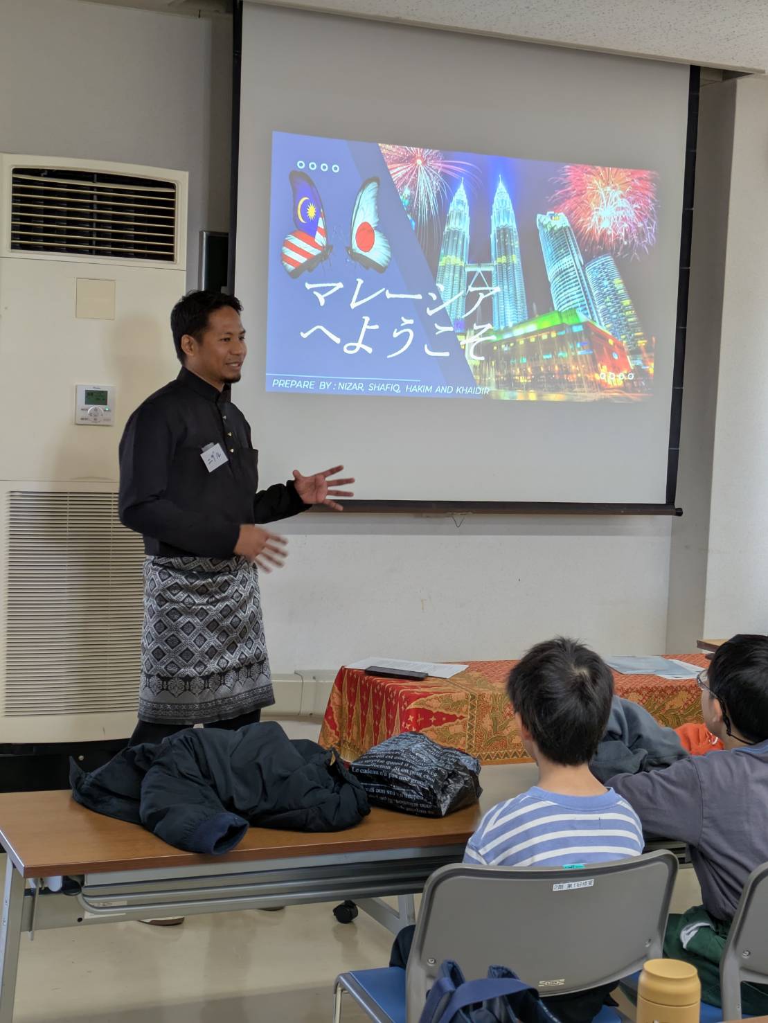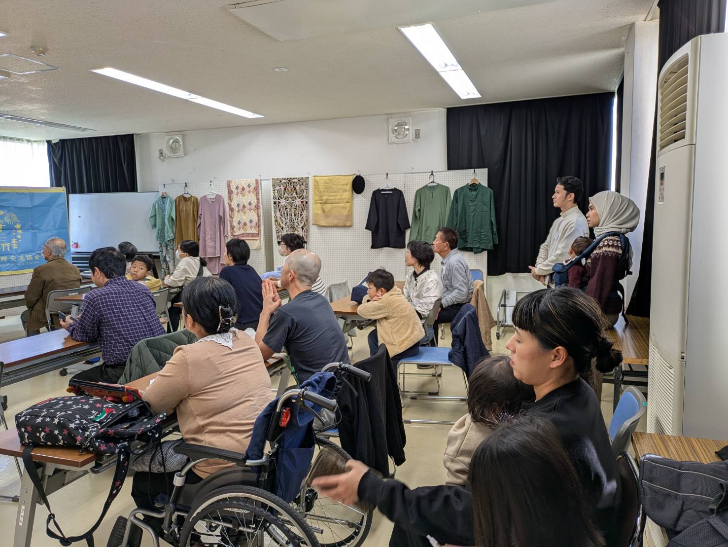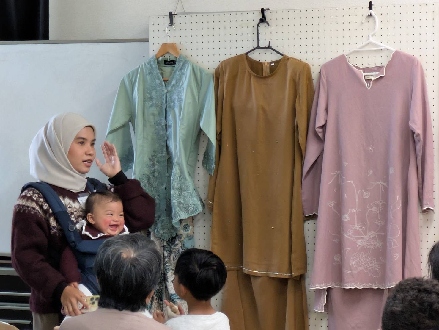 興味津々!みなさん熱心に話を聞いておられました。マレーシアの正装の洋服が飾られていました。
