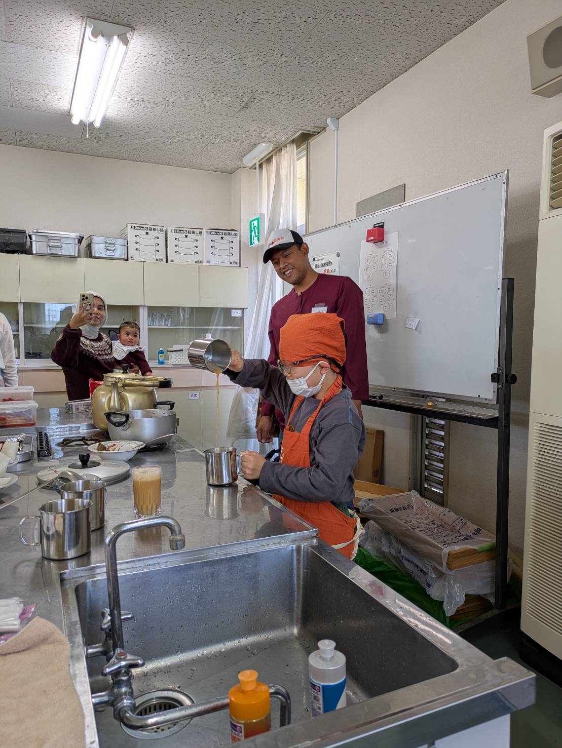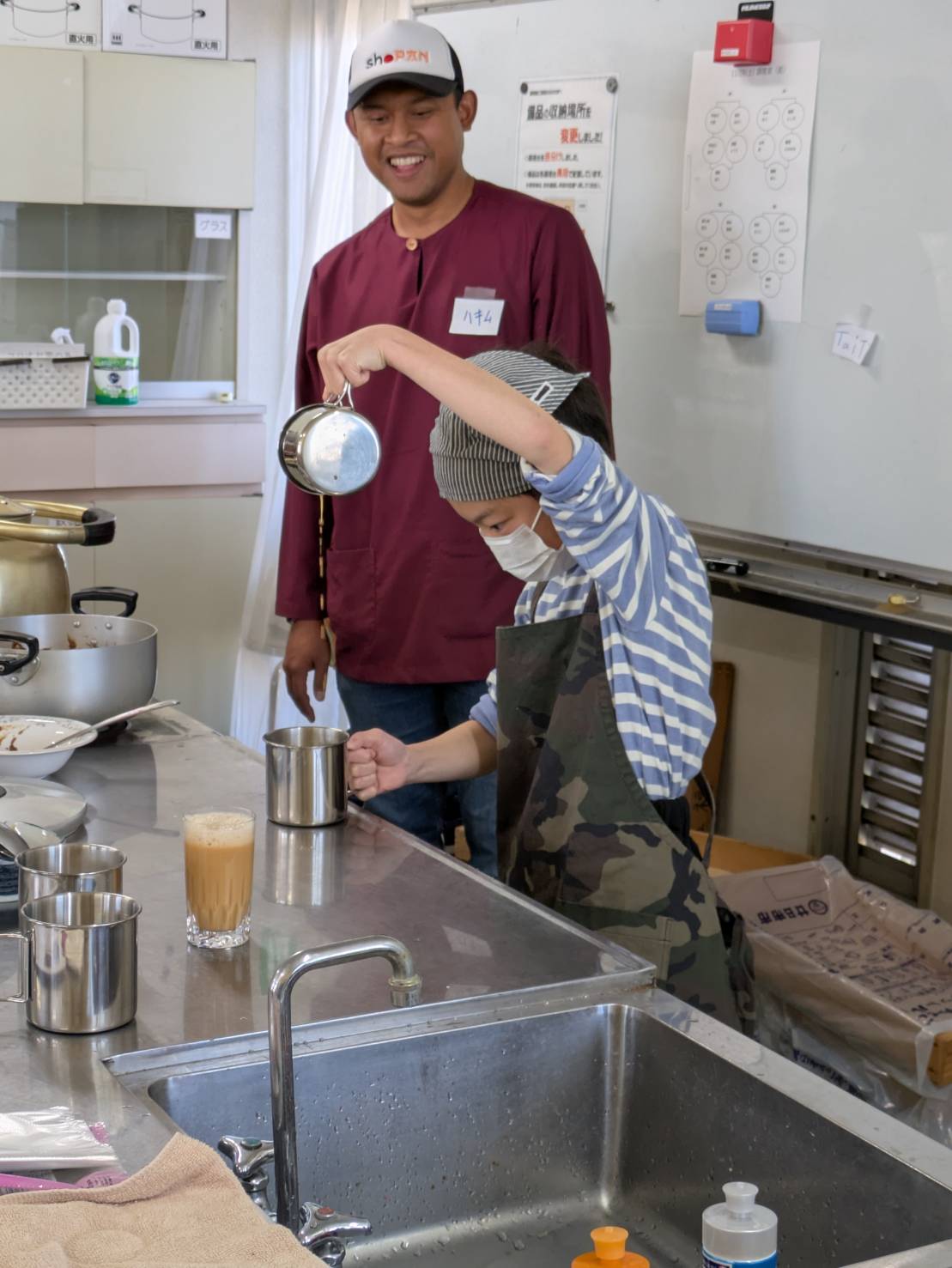 4グループに分かれて調理しました。Teh Tarik(日本のミルクティーのようなもの)を作るところは、子どもたちが積極的に挑戦しました。二つのカップでティーを移していくのですが、引っ張るように上に上にあげながらすると泡が立って美味しくなるそうです。