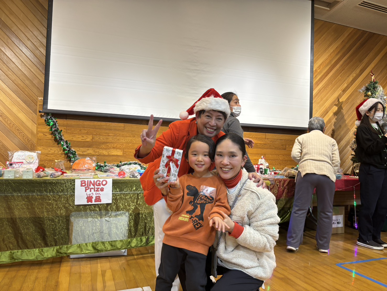 食事をしながら恒例のBINGOもしました。参加者全員に景品は行き渡ったのですが、選ぶときに時間をかけておられました。それぞれ良いクリスマスプレゼントになったでしょうか?