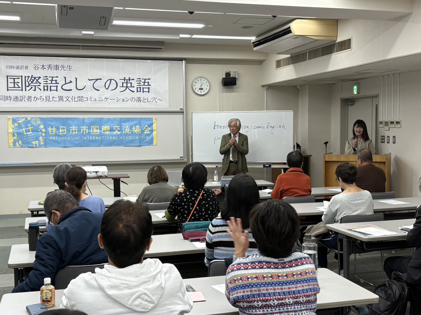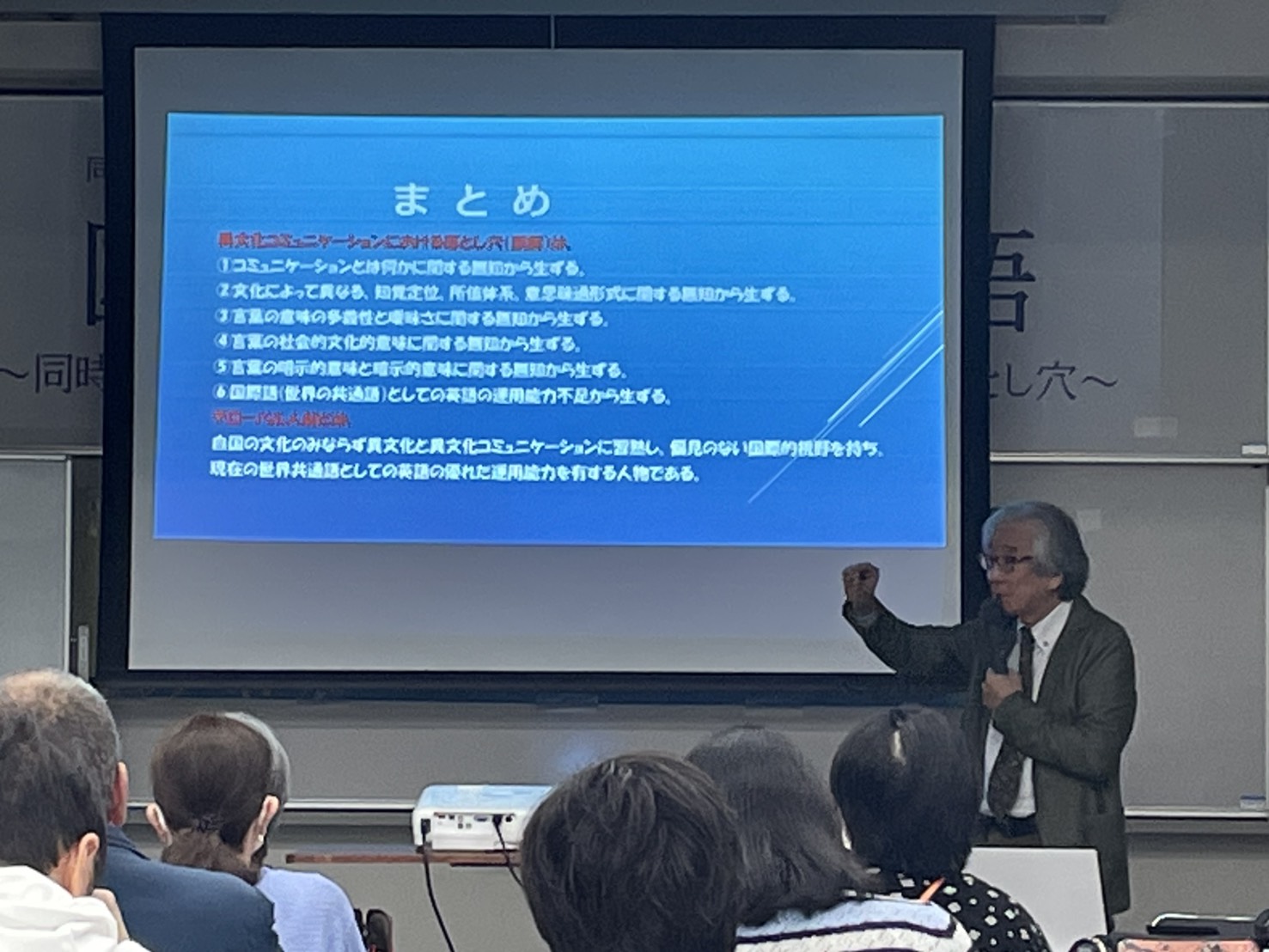 2025年11月23日(日曜日)に同時通訳者谷本秀康先生を講師にお招きし、特別講演会を開催致しました。「国際語としての英語~同時通訳者から見た異文化間コミュニケーションの落とし穴~」というタイトルで、先生の通訳経験を基に、貴重なお話をしていただきました。英語の同じ文章でも、国や文化背景が違えば、違う意味で解釈することがあることなど事例を提示され、実りのある時間となりました。