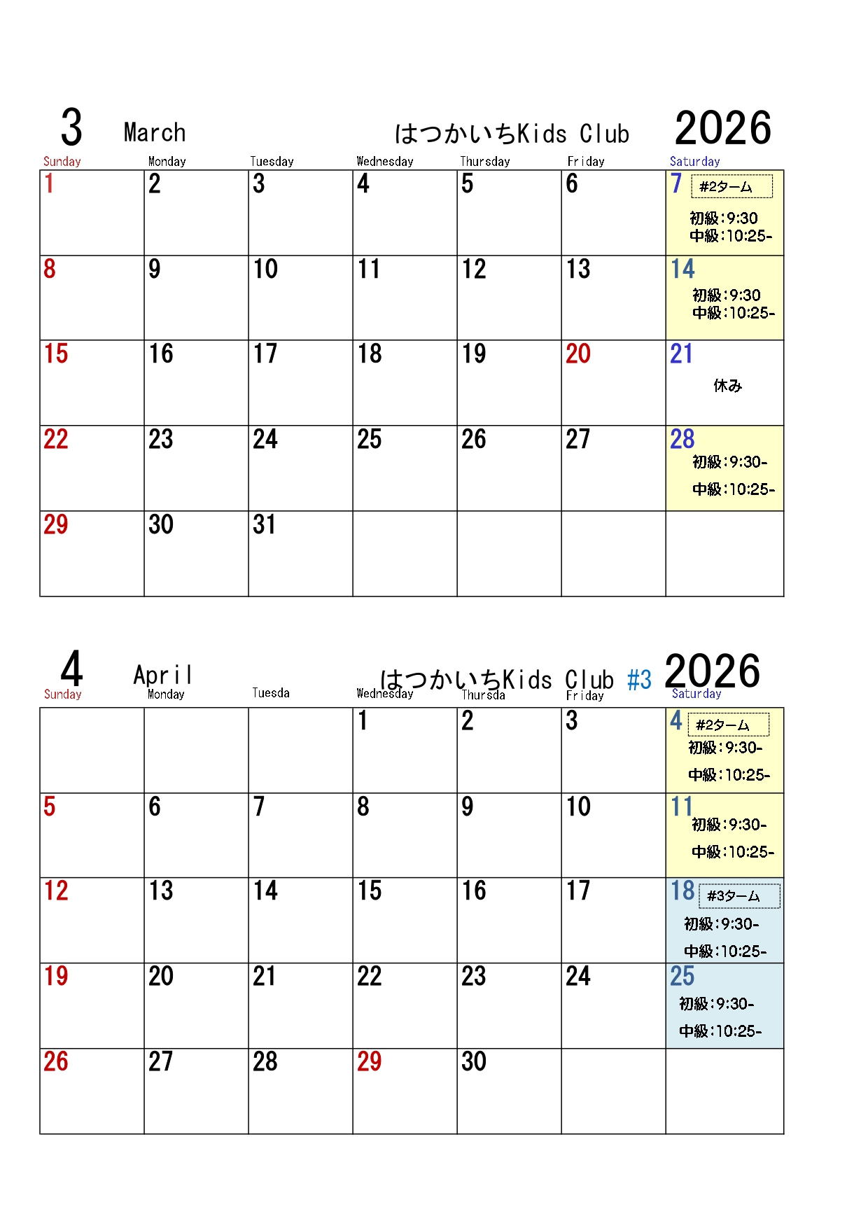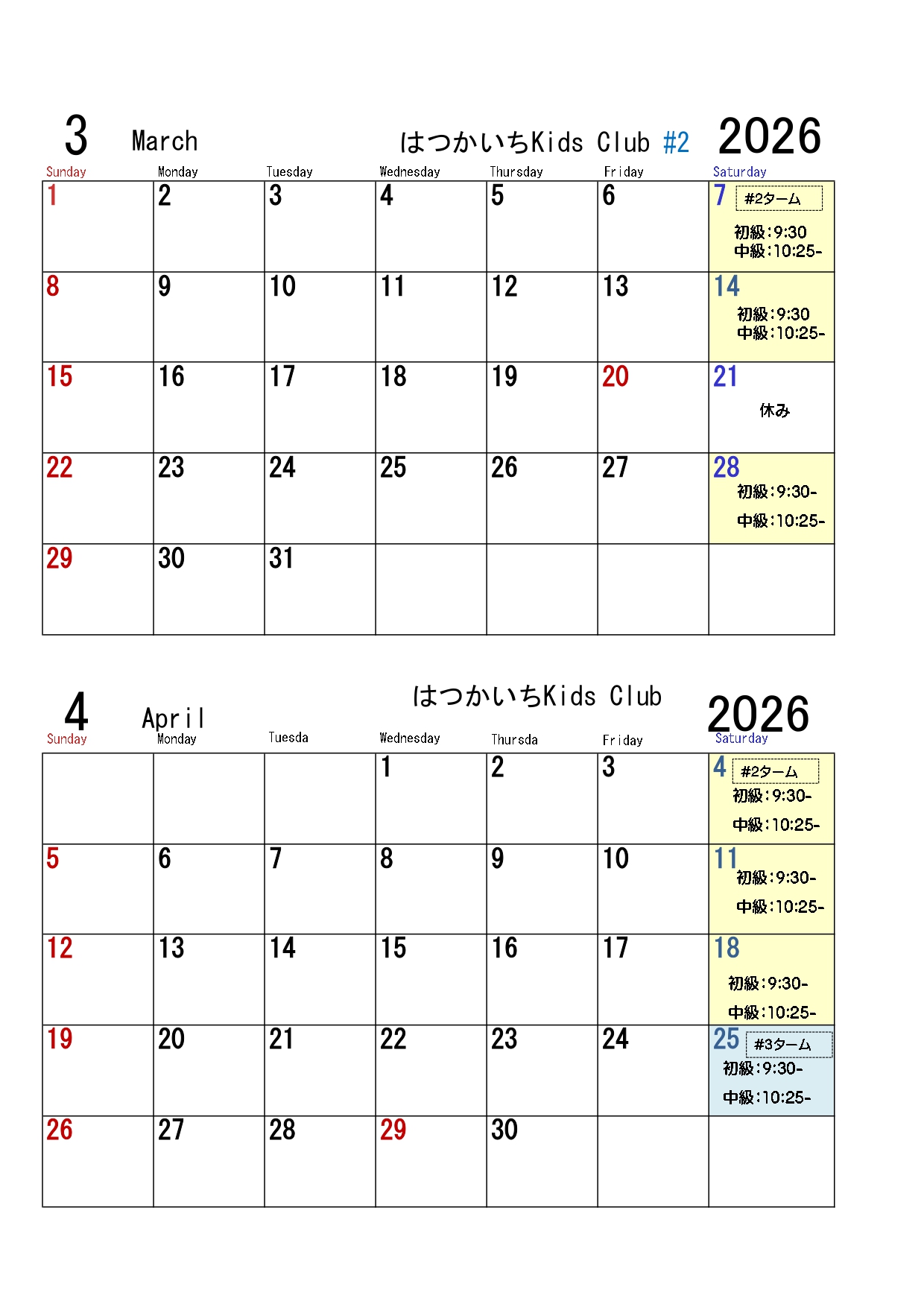 最新カレンダーです「はつかいちKids' Club」は1ターム6回5000円になっています。ターム途中の参加でも大丈夫です!