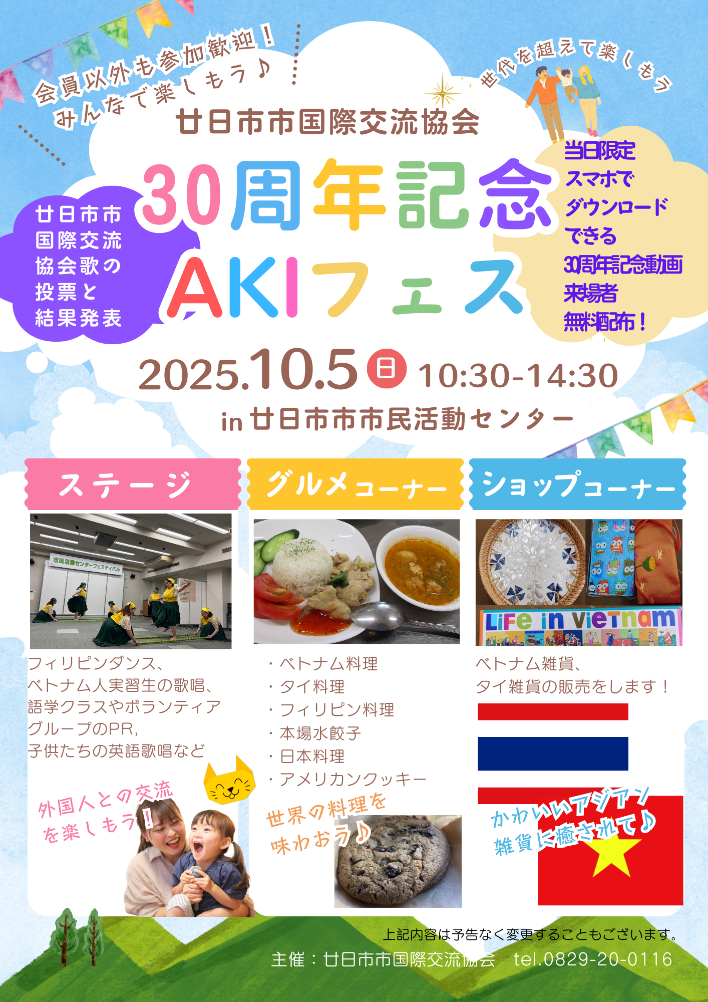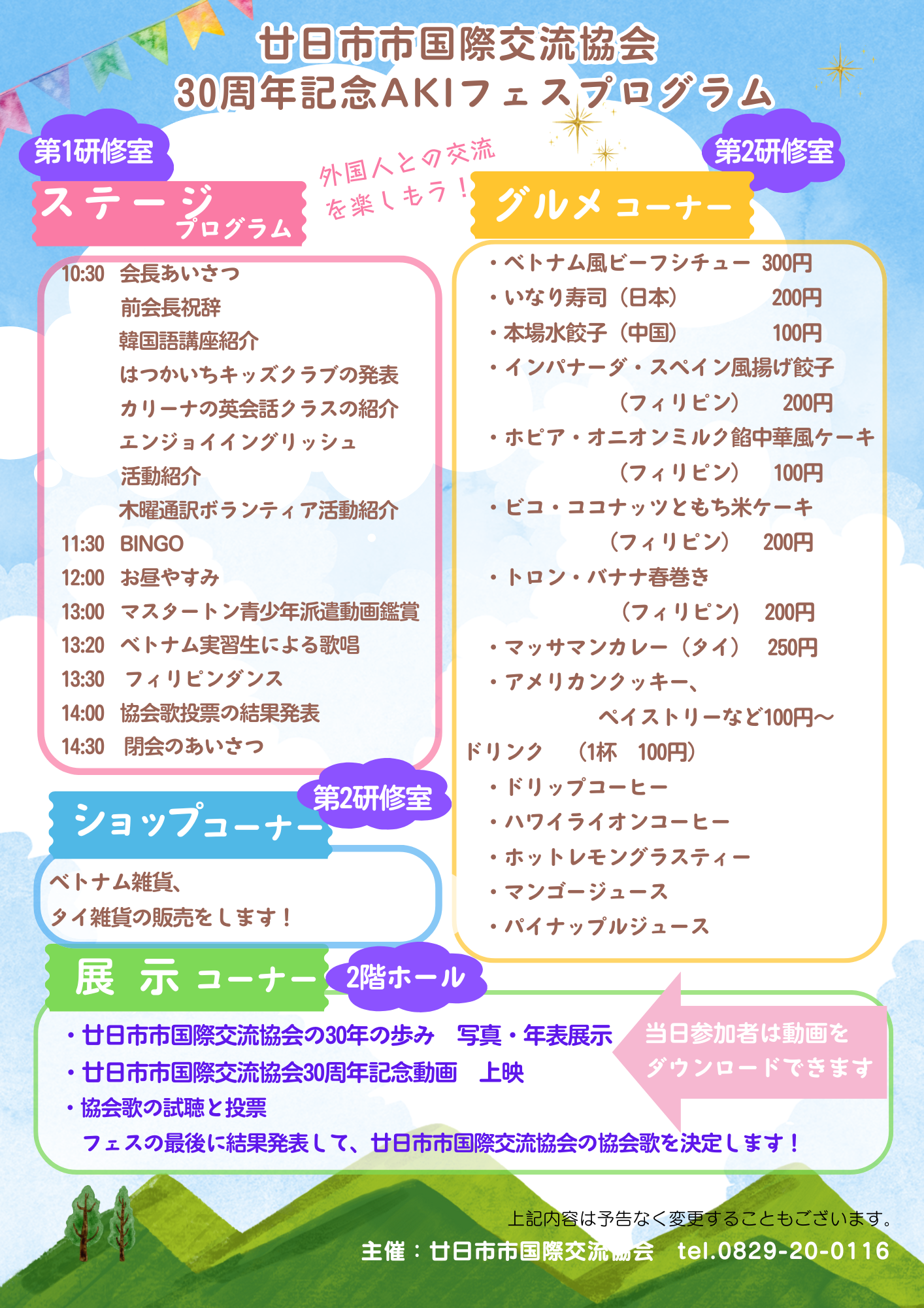 廿日市市国際交流協会は設立30周年を迎えます。これまでの歩みを祝すと同時に今後の発展を祈念する大イベントを10月5日に開催します!ぜひ皆様お越しください。内容を簡単にご紹介します。当初予定しておりました谷本先生のミニ講演とマジックショーは、都合によりやむを得ず中止となりました。その時間を使ってBINGO大会を行います。皆様奮ってお越しください。