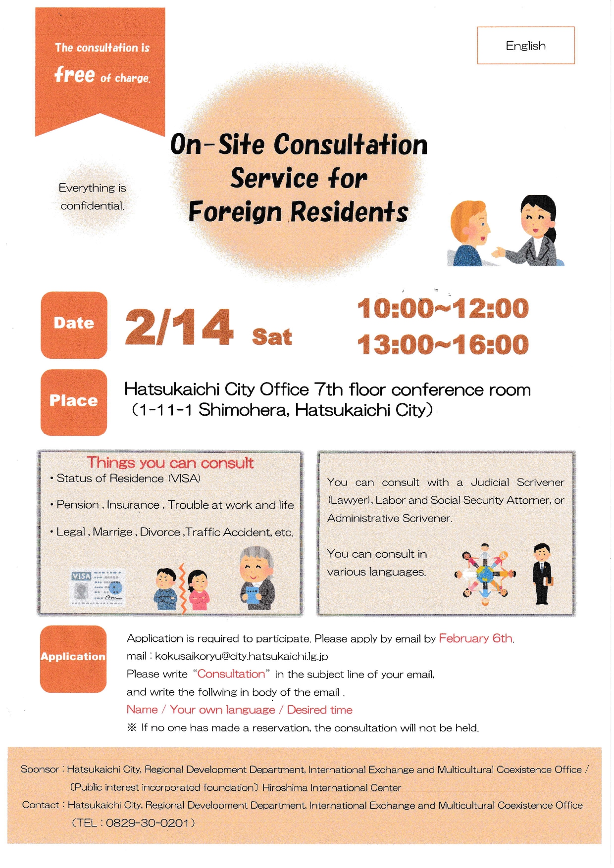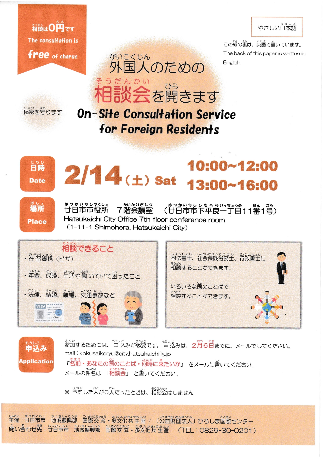 外国人住民等のための出張相談を、廿日市で開催します。近所でお困りの外国人の方がおられましたら、お声かけください。