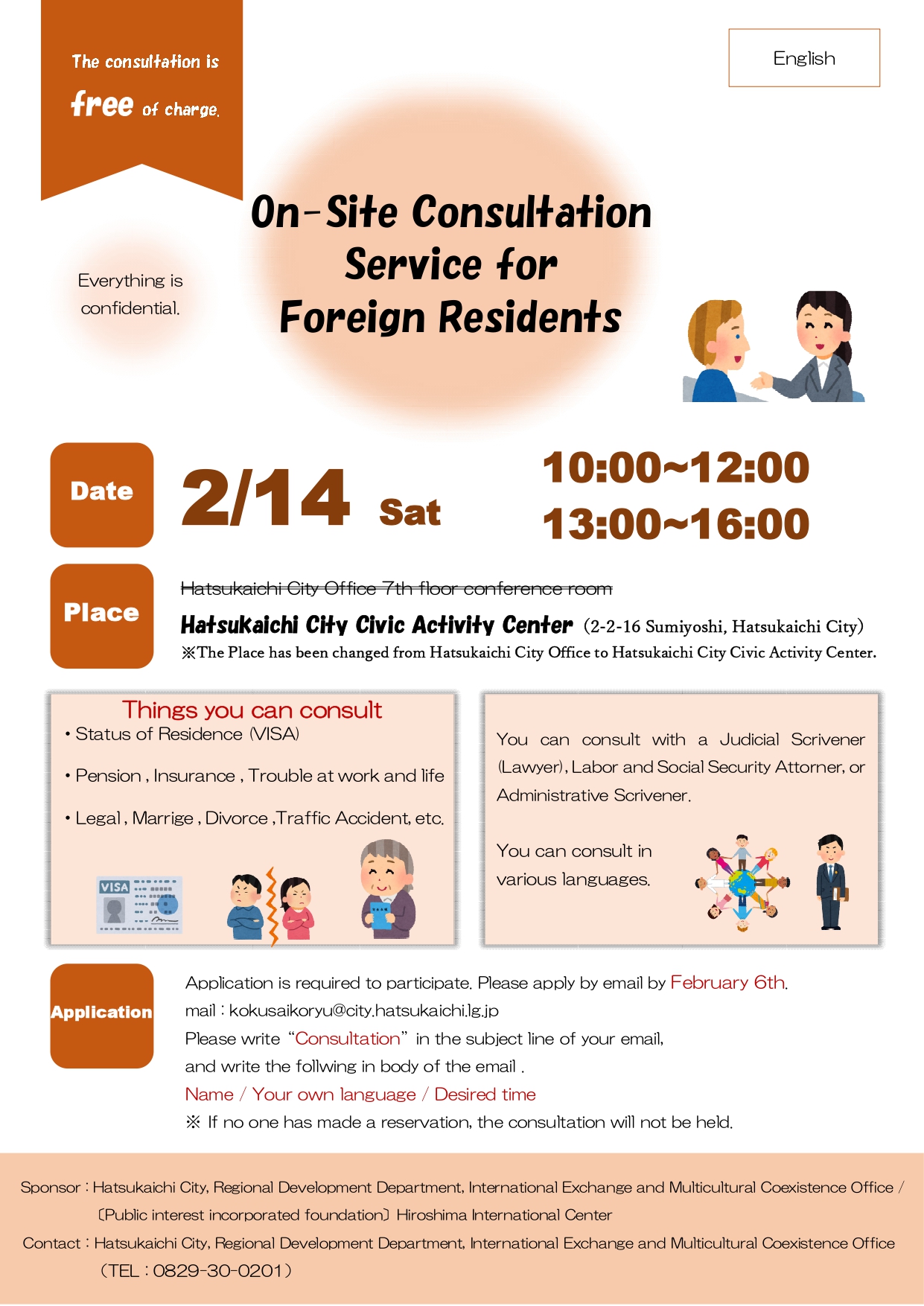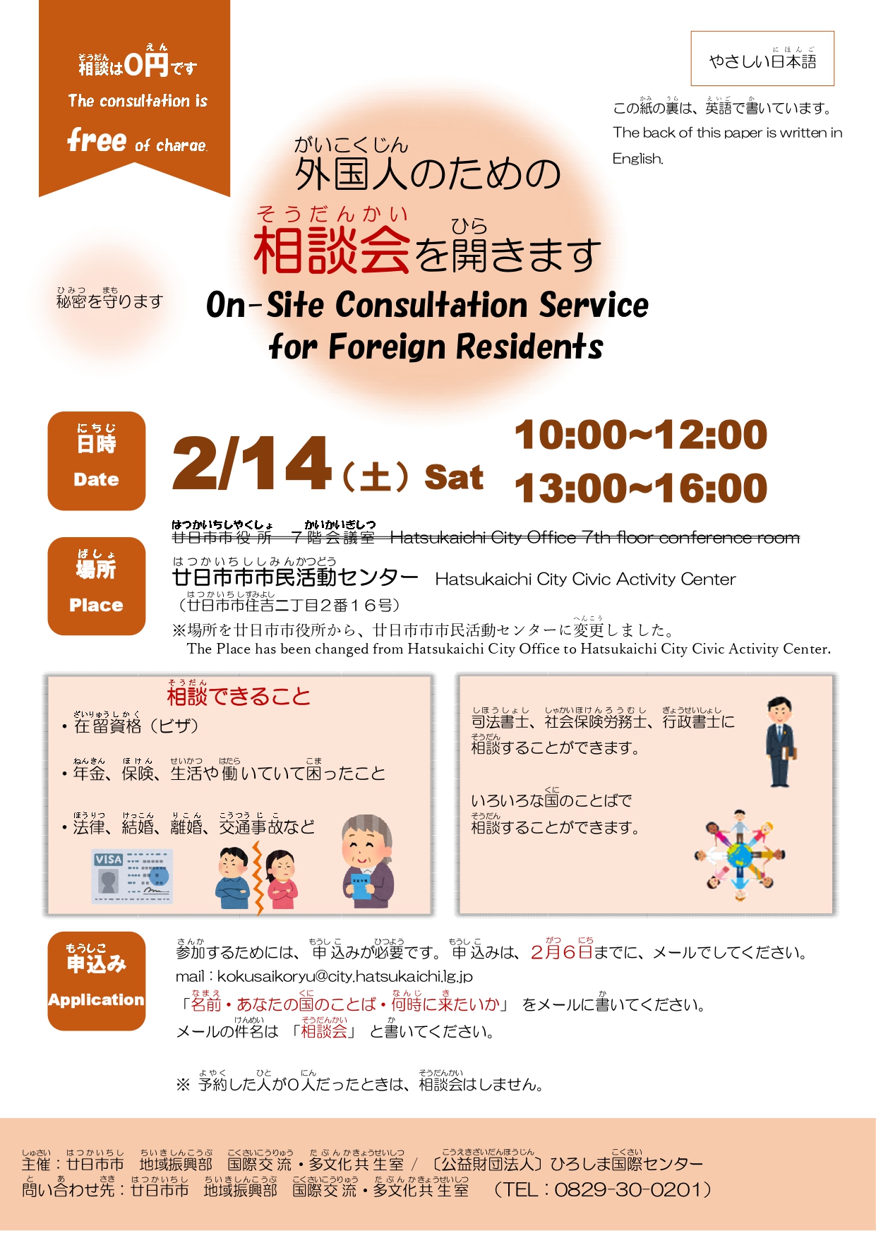 2026年02月14日 外国人住民のための出張相談 廿日市市で相談会を開催します! 会場が廿日市市市民活動センターに変わりました! 外国人住民等のための出張相談を、廿日市で開催します。近所でお困りの外国人の方がおられましたら、お声かけください。
